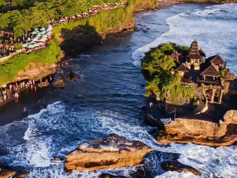 Kedua, Tanah Lot. Tanah Lot adalah sebuah pura laut yang terletak di atas tebing karang di dekat pantai. Tempat ini menawarkan pemandangan matahari terbenam yang indah, terutama saat musim kemarau. Selain itu, kamu juga dapat melihat keindahan arsitektur pura yang unik dan menarik.